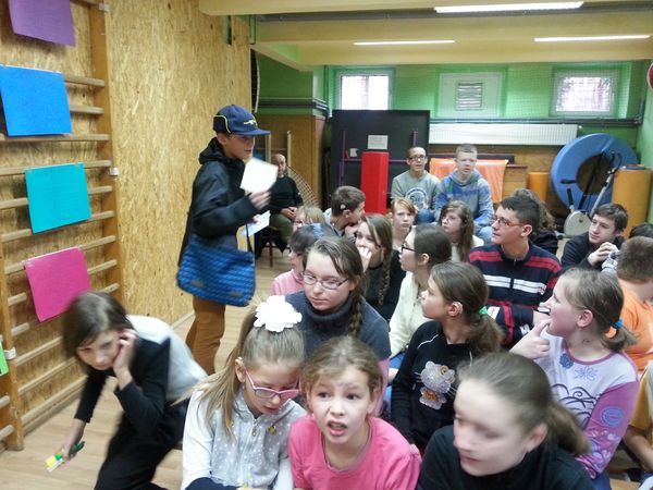 Najpierw wspólnie rozwiązywaliśmy krzyżówkę. Później odwiedził nas listonosz i wręczył każdej klasie list z zadaniem do wykonania. Każde zadanie związane było z życiem i pracą naszej Patronki.