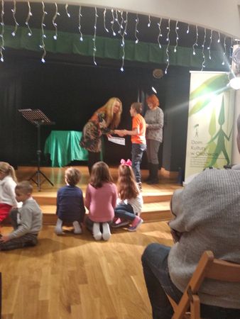 W dniu 4 grudnia br. w Domu Kultury Olszówka odbyło się uroczyste rozdanie nagród i dyplomów, na którym obecni byli laureaci, ich Rodzice i nasze koleżanki pani Ola i pani Asia. Było bardzo pięknie i miło. Obejrzeliśmy przedstawienie