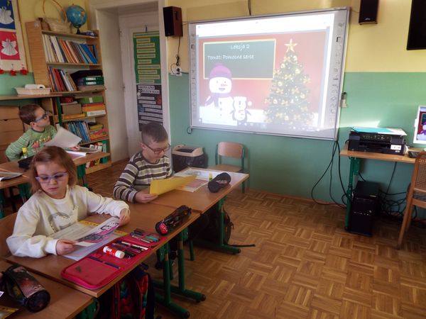 W dniu 16.12.2019 r. przeprowadzono 2 lekcje w klasach I-III af oraz klasie II ns w ramach projektu „Dzieci uczą rodziców”. Temat lekcji – Pomocne serce. W zajęciach brało udział 9 uczniów. Podczas zajęć uczniowie przeprowadzili doświadczenie na ławeczce gimnastycznej (po połączeniu się w pary mieli za zadanie wzajemne przeprowadzenie się po ławce z zawiązanymi oczami). Doświadczenie miało na celu uzmysłowienie uczniom: Co jest lepsze? Czy pomagać innym, czy też korzystać z pomocy? Uczniowie prawidłowo odczytali sygnały i wyciągnęli wnioski. Następnie przeprowadzono burzę mózgów: Na czym polega pomoc? Dlaczego należy pomagać innym? Jak możemy pomóc innym? Potem wspólnie w kole zaśpiewano piosenkę „Pomagam, bo lubię”. Na zakończenie zajęć każdy z uczniów wykonał plakat zatytułowany „Pomaganie jest fajne”. Na niebieskiej kartce symbolizującej niebo nakleił żółte koło oraz promienie słoneczne na których wypisał, dlaczego należy pomagać. Jako zadanie do domu uczniowie otrzymali obrazek do pokolorowania wspólnie z rodzicami.