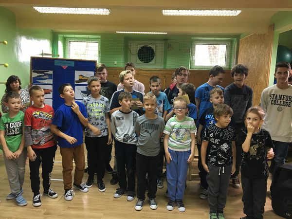 Zebraliśmy się wszyscy na sali gimnastycznej, aby w zabawny sposób uczcić święto naszych kolegów.